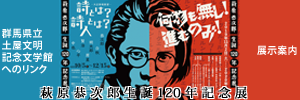 前橋文学館 萩原朔太郎 朔太郎の説明 朔太郎賞 展 示 現在の企画展 過去の企画展 催し物 企画展関連イベント その他イベント リーディングシアター 過去の催し物 施設概要 館長のあいさつ 施設案内 料金案内 貸館 年報・館報 ミュージアムショップ ブログ 萩原朔太郎記念館 収蔵資料 蔵書検索 資料利用申請 アクセス お問い合わせ 前橋文学館からのお知らせ 古いお知らせはこちら> 2020年01月14日 *御礼*「ドラマチックな重鋼!! 髙荷義之原画展」 2020年01月10日 いよいよ13日(月・祝)まで!企画展「ドラマチックな重鋼!! 髙荷義之原画展」 2020年01月09日 「わたしが描く『朔太郎詩』の世界展」を開催。表彰状贈呈式と朗読会を行います。 2020年01月07日 ムットーニ劇場、調整中のお知らせ 2020年01月04日 前橋文学館から新年のごあいさつとイベントのお知らせ 開催中・開催予定の企画展 >>関連イベントについてはこちらをご覧ください 前橋文学館SNS サイト内検索 観覧時間 午前9時~午後5時 1月 2月 3月 4月 5月 6月 7月 8月 9月 10月 11月 12月 2020 2021 2022 2023 2024 2025 2026 2027 2028 2029 2030 2031 2032 2033 2034 2035 月 火 水 木 金 土 日 Loading... << Previous | Next >> 1 2 3 4 5 6 7 8 9 10 11 12 13 14 15 16 17 18 19 20 21 22 23 24 25 26 27 28 29 30 31 休館日 イベント開催日 無料開放日 関連リンク ▲TOP