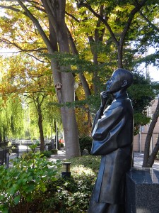 11月も終わりに差し掛かり、文学館周辺もすっかり肌寒くなりました。色付いた落葉が朔太郎像の上に散ってくる様子は、「さびしい人格」(『月に吠える』)の、“ああ、その言葉は秋の落葉のやうに、そうそうとして膝の上にも散つてくるではないか。”という一行を彷彿とさせます。