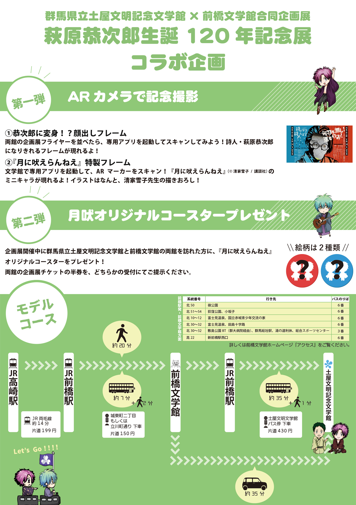 ミニキャラになった3人がとってもキュートなこちらは、清家先生による本展のための描き下ろしイラストとなっております。グンマー推しの方必見!ぜひお迎えください。なお両館において上記のイラストをフレームに用いた記念撮影も可能です。土屋文明記念文学館とのコラボ企画概要についてはこちらをご確認ください。