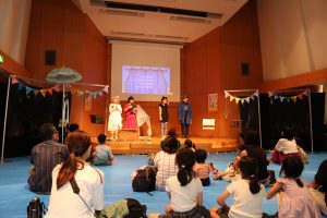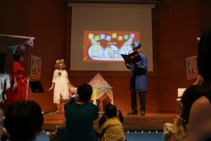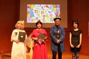 現在開催中の「さくたろういきものずかん」展に関連して、「わくわくいきものカーニバル」第1回目を開催いたしました。たくさんのこどもたちが、読み聞かせユニットのドロップスの皆さんのお話に熱心に聞き入ったり、萩原朔美館長扮する「青猫さん」が出題したオノマトペクイズ(鳴き声のオノマトペをヒントに動物を当てるもの)に、全身を使って参加してくれました。ドロップスさんの読み聞かせやお芝居は自然体でありながら表現豊かで、見ているだけで笑顔がこぼれる素敵な空間でした。
