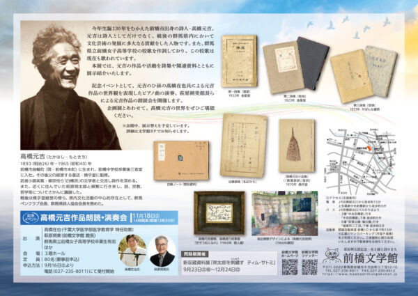 前橋文学館 萩原朔太郎とは 朔太郎の説明 萩原朔太郎賞 施設概要 特別館長のあいさつ 施設案内 利用案内 年報・館報・ブログ ミュージアムショップ 展 示 現在の企画展 過去の企画展 催し物 企画展関連イベント その他イベント 過去の催し物 収蔵資料 収蔵資料検索 資料利用申請 資料の収集方針 アクセス お問い合わせ 「空ぢう 虹になれ−生誕130年記念高橋元吉展」を開催します 2023年08月04日 9月16日(土)より、前橋市の詩人・高橋元吉の展覧会を開催します。 是非ご来場ください! 📖企画展詳細はこちらをご覧ください。 📖記念イベント詳細はこちらをご覧ください。 ▲TOP