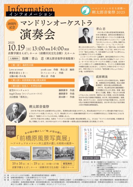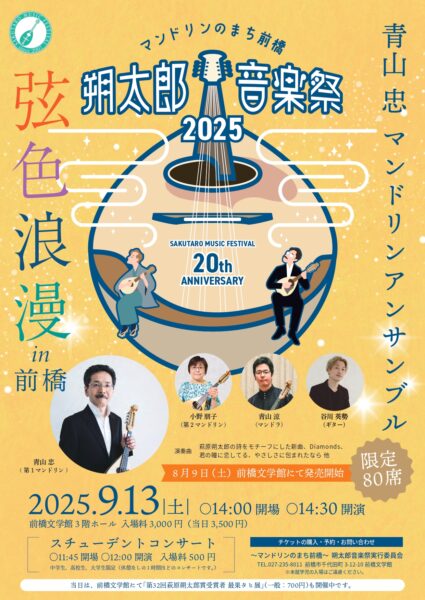 前橋文学館 萩原朔太郎とは 朔太郎の説明 萩原朔太郎賞 施設概要 特別館長のあいさつ 施設案内 利用案内 年報・館報・ブログ ミュージアムショップ 展 示 現在の企画展 過去の企画展 催し物 企画展関連イベント その他イベント 過去の催し物 収蔵資料 収蔵資料検索 資料利用申請 資料の収集方針 アクセス お問い合わせ 【終了しました】「青山忠マンドリンアンサンブル弦色浪漫in前橋」を開催します 2025年08月08日 9月13日(土)に「朔太郎音楽祭2025 青山忠マンドリンアンサンブル弦色浪漫in前橋」が開催されます。 ご予約、チケット販売は、8月9日(土)からです。 詳しくは、こちらをご覧ください。 フライヤーはこちら ▲TOP