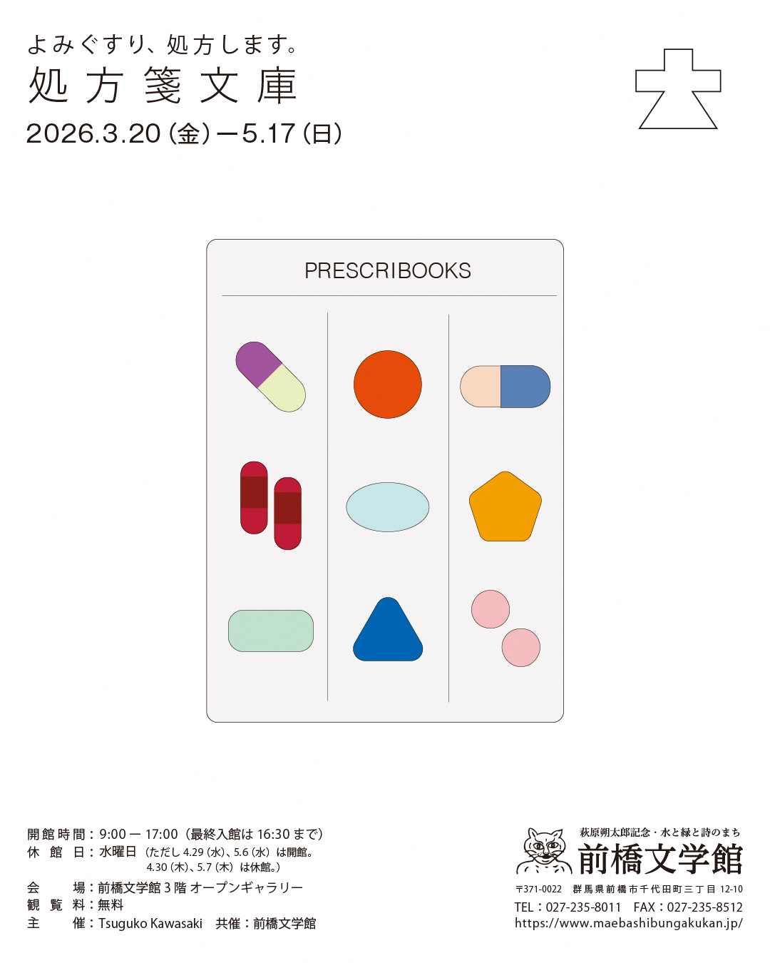 前橋文学館 萩原朔太郎とは 朔太郎の説明 萩原朔太郎賞 施設概要 特別館長のあいさつ 施設案内 利用案内 年報・館報・ブログ ミュージアムショップ 展 示 現在の企画展 過去の企画展 催し物 企画展関連イベント その他イベント 過去の催し物 収蔵資料 収蔵資料検索 資料利用申請 資料の収集方針 アクセス お問い合わせ 開催中・開催予定の企画展 よみぐすり、処方します。処方箋文庫 期 間 : 2026年03月20日(金) ~ 2026年05月17日(日) 会 場 : 3Fオープンギャラリー 悪筆。文字書体をなさず。冷汗冷汗。—萩原朔太郎と文字 期 間 : 2026年03月21日(土) ~ 2026年05月24日(日) 会 場 : 2階展示室 ▲TOP