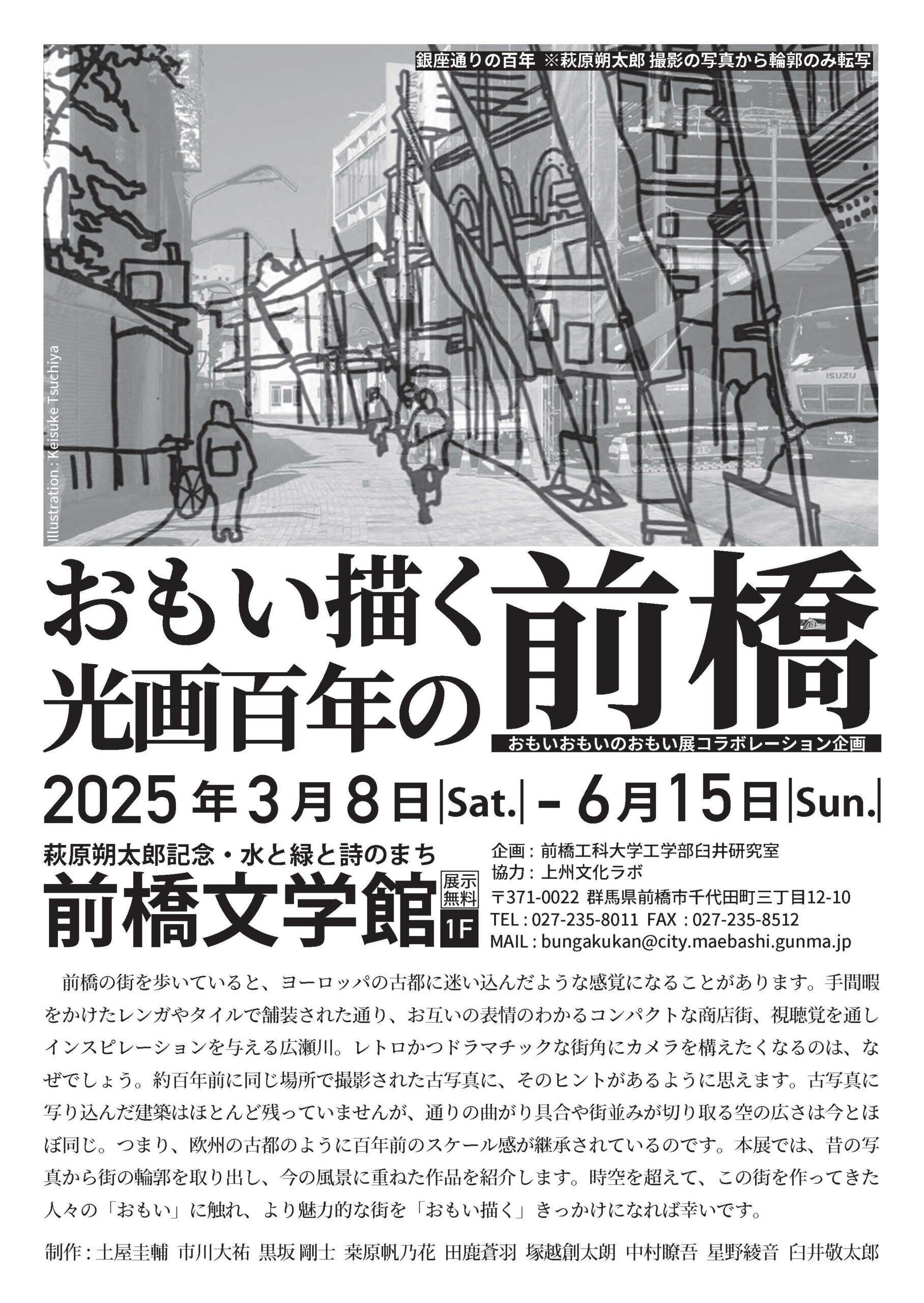 | 備考 | 本展と同時開始!前橋工科大学工学部臼井研究室とのコラボ企画「おもい描く光画百年の前橋」![]() 前橋文学館企画展「おもいおもいのおもい展」とのコラボ企画として、前橋工科大学工学部臼井研究室にて「おもい描く光画百年の前橋」を開催します。会場は前橋文学館1F、観覧料無料です。皆様お誘い合わせの上、ぜひご来場ください。 前橋の街を歩いていると、ヨーロッパの古都に迷い込んだような感覚になることがあります。手間暇をかけたレンガやタイルで舗装された通り、お互いの表情のわかるコンパクトな商店街、視聴覚を通しインスピレーションを与える広瀬川。レトロかつドラマチックな街角にカメラを構えたくなるのは、なぜでしょう。約百年前に同じ場所で撮影された古写真に、そのヒントがあるように思えます。古写真に写り込んだ建築はほとんど残っていませんが、通りの曲がり具合や街並みが切り取る空の広さは今とほぼ同じ。つまり、欧州の古都のように百年前のスケール感が継承されているのです。本展では、昔の写真から街の輪郭を取り出し、今の風景に重ねた作品を紹介します。時空を超えて、この街を作ってきた人々の「おもい」に触れ、より魅力的な街を「おもい描く」きっかけになれば幸いです。 リンクページ↓ おもい描く光画百年の前橋 |