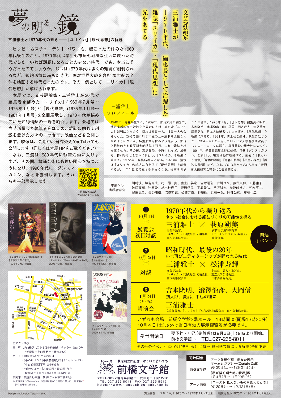 | フライヤーPDF | 夢の明るい鏡ー三浦雅⼠と1970年代の輝き: 「ユリイカ」 「現代思想」の軌跡フライヤーPDF |