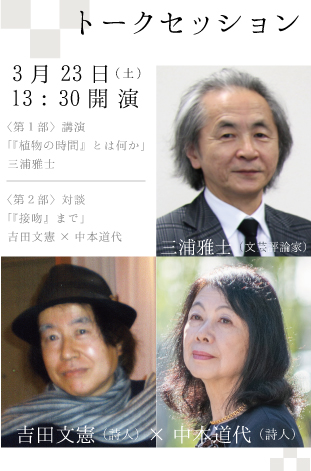 | 内容 | 中本道代展に関連して、以下のような内容のトークセッションを開催いたします。 〈第1部〉講演「『植物の時間』とは何か」三浦雅士(文芸評論家) 〈第2部〉対談「『接吻』まで」杉本徹(詩人)×中本道代(詩人) 3月23日(土)に開催予定の「接吻・中本道代展」記念イベントのトークセッション第2部に出演を予定しておりました詩人の吉田文憲さんが、体調不良のためご出演がかなわず、代役として、吉田文憲さんや中本道代さんと同人誌活動をともにしている詩人の杉本徹さんが急遽ご出演くださることになりましたことお知らせいたします。 |