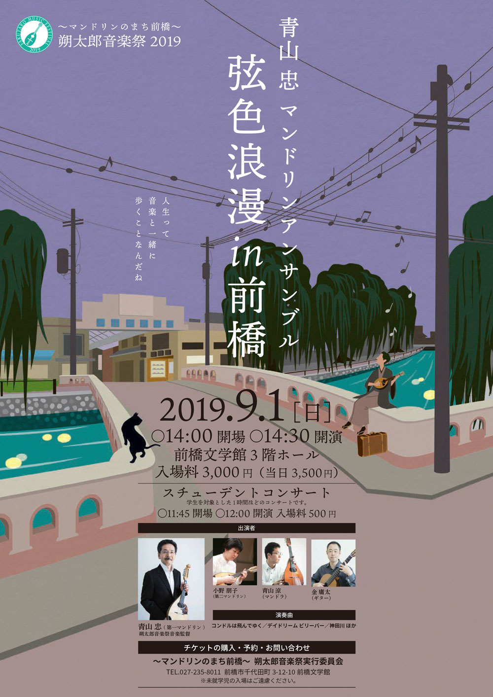 | 内容 | 前橋文学館で朔太郎音楽祭「青山忠マンドリンアンサンブル弦色浪漫in前橋」を9月1日に開催。青山忠さんによるマンドリン四重奏を前橋文学館にて行います。先着100名。お電話でのお申し込みは前橋文学館まで。また、同日12時からはスチューデントコンサートも開催します。 |