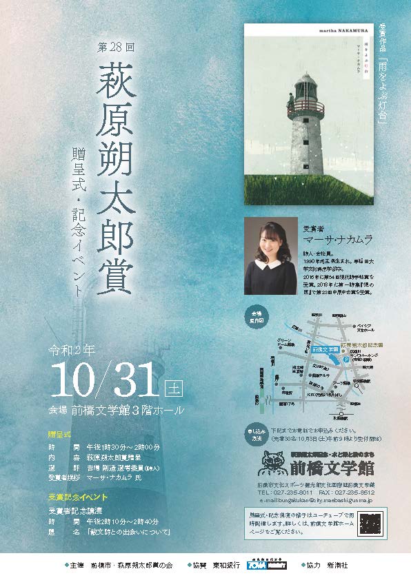 | 内容 | 第28回萩原朔太郎賞贈呈式を開催します。 詩集「雨をよぶ灯台」で第28回萩原朔太郎賞を最年少受賞したマーサ・ナカムラさん。 賞の贈呈のほか、最年少での受賞となったマーサさんの記念講演も行います。 また、当日の様子はインターネットで同時配信予定です。 詳しくは後日ご案内いたします。 |
