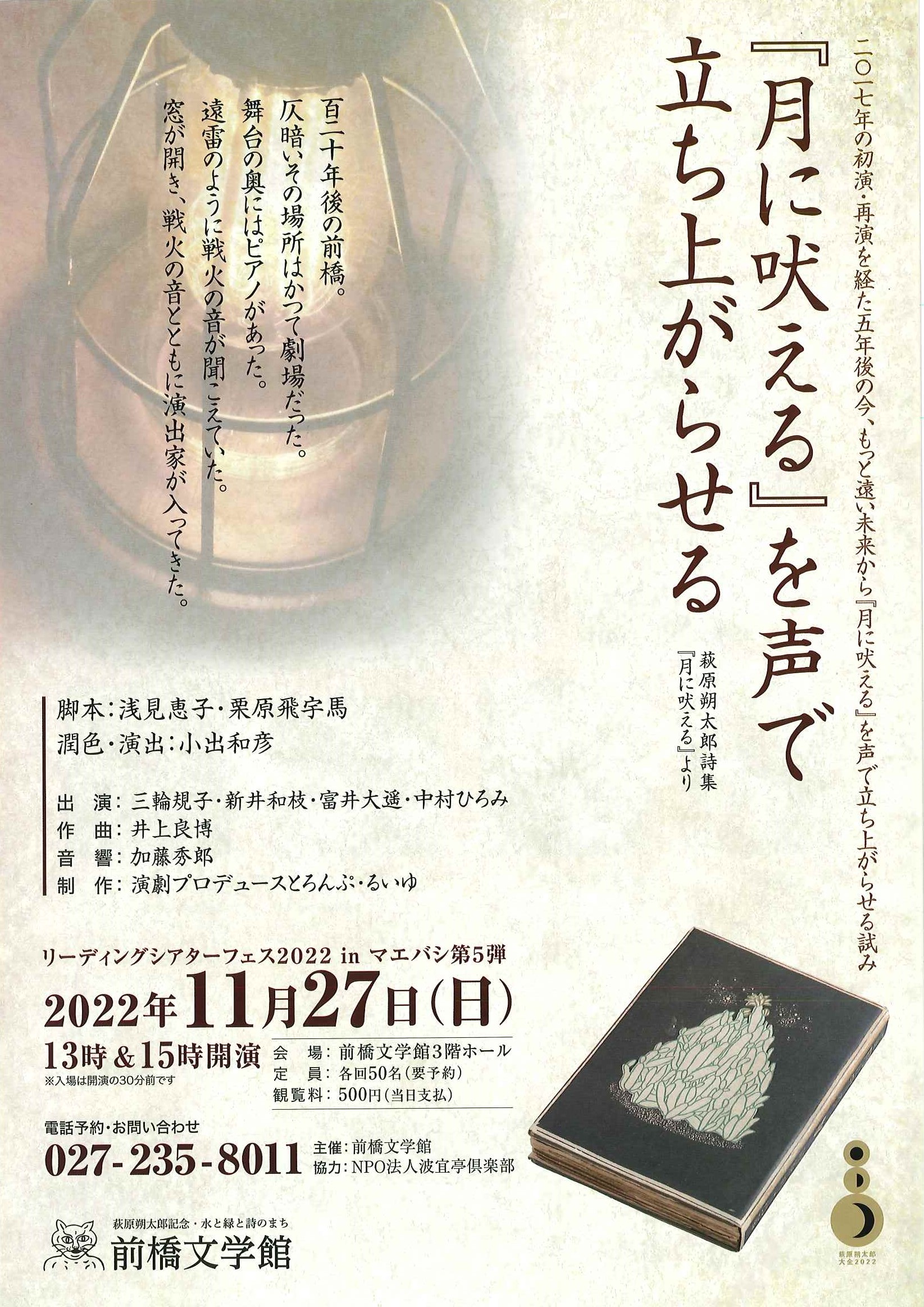 | 内容 | リーディングシアター「『月に吠える』を声で立ち上がらせる」 お申込み受付中 前橋文学館(027-235-8011)まで ■あらすじ 120年後の前橋。遠く戦火の音が聞こえるかつての劇場で、120年前にこの街で書かれた台本の読み合わせが始まる。「とある高校のグループ研究で、内向的な少年・宮沢と、同級生の伊藤、平田が萩原朔太郎の詩集『月に吠える』について発表する準備を進めている。詩人たちのスキャンダラスな面にのみ注目しがちな三人だったが、担任の大久保の教えや、抑圧的な校長との対立を経て、詩人たちが詩集にこめた深い意味を感じとっていく。」 <脚本> 浅見恵子、栗原飛宇馬 <潤色・演出> 小出和彦 <出演> 三輪規子 新井和枝 富井大遥 中村ひろみ <作曲> 井上良博 <音響> 加藤秀郎 <制作> 演劇プロデュースとろんぷ・るいゆ |