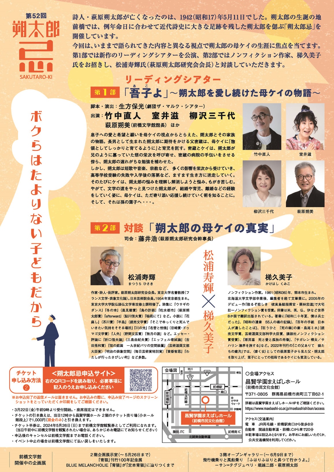 | 内容 | 第52回朔太郎忌を開催します。 詩人・萩原朔太郎が亡くなったのは、1942(昭和17)年5月11日でした。朔太郎の生誕の地前橋では、例年命日に合わせて近代詩史に大きな足跡を残した朔太郎を偲ぶ「朔太郎忌」を開催しています。 今回は、いままで語られてきた内容と異なる視点で朔太郎の母ケイの生涯に焦点を当てます。 第1部では新作のリーディングシアターを公演、第2部ではノンフィクション作家、梯久美子さんをお招きし、松浦寿輝萩原朔太郎研究会会長と対談していただきます。 第一部 リーディングシアター「吾子よ」~朔太郎を愛し続けた母ケイの物語~ 出演 竹中直人 室井滋 柳沢三千代 萩原朔美 前原明博 山越勇武 中村ひろみ 見城由香 大島加代子 大島政昭 脚本・演出 生方保光(劇団ザ・マルクシアター) 第二部 対談「朔太郎の母ケイの真実」 出演 梯 久美子(ノンフィクション作家) 松浦寿輝(詩人・作家・東京大学名誉教授・萩原朔太郎研究会会長) 司会 藤井 浩(萩原朔太郎研究会幹事長) |