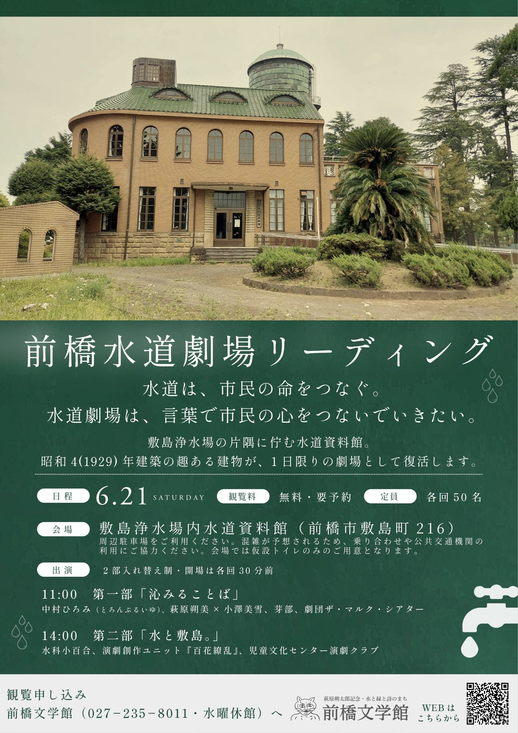 | 内容 | 水道は、市民の命をつなぐ。 水道劇場は、言葉で市民の心をつないでいきたい。 敷島浄水場の片隅に佇む水道資料館。 昭和4(1929)年建築の趣ある建物が、一日限りの劇場として復活します。 テーマ・出演 第一部「沁みることば」 中村ひろみ(とろんぷるいゆ)、萩原朔美✕小澤美雪、芽部、劇団ザ・マルク・シアター 第二部「水と、敷島。」 水科小百合、演劇創作ユニット「百花繚乱」、児童文化センター演劇クラブ |