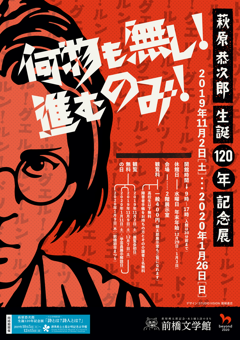 前橋文学館 萩原朔太郎とは 朔太郎の説明 萩原朔太郎賞 施設概要 特別館長のあいさつ 施設案内 利用案内 年報・館報・ブログ ミュージアムショップ 展 示 現在の企画展 過去の企画展 催し物 企画展関連イベント その他イベント 過去の催し物 収蔵資料 収蔵資料検索 資料利用申請 資料の収集方針 アクセス お問い合わせ 2019年の企画展 おばあちゃんのほっこりごはん 野村たかあき展/わたしが描く『朔太郎詩』の絵画展 期 間 : 2019年01月26日(土) ~ 2019年04月07日(日) 会 場 : 3階オープンギャラリー 第26回 萩原朔太郎賞受賞者展 接吻 中本道代 期 間 : 2019年02月02日(土) ~ 2019年04月14日(日) 会 場 : 2階展示室 萩原朔美の仕事Vol.2 定点観測展 期 間 : 2019年04月20日(土) ~ 2019年06月23日(日) 会 場 : 前橋文学館 3階オープンギャラリー 詩の未来へ―「現代詩手帖」の60年― 期 間 : 2019年04月27日(土) ~ 2019年07月07日(日) 会 場 : 2階展示室 榎本了壱「線セーション」展―私が出会った表現者たちII 期 間 : 2019年06月29日(土) ~ 2019年09月29日(日) 会 場 : 3階オープンギャラリー 羽の生えた想像力―阿部智里展 期 間 : 2019年07月20日(土) ~ 2019年10月20日(日) 会 場 : 2階展示室 没後100年記念 平井晩村展 期 間 : 2019年09月01日(日) ~ 2019年10月20日(日) 会 場 : 1階ロビー ドラマチックな重鋼!! 髙荷義之原画展 期 間 : 2019年10月05日(土) ~ 2020年01月13日(月) 会 場 : 3階オープンギャラリー 萩原恭次郎生誕120年記念展「何物も無し!進むのみ!」 期 間 : 2019年11月02日(土) ~ 2020年01月26日(日) 会 場 : 2階展示室 ▲TOP