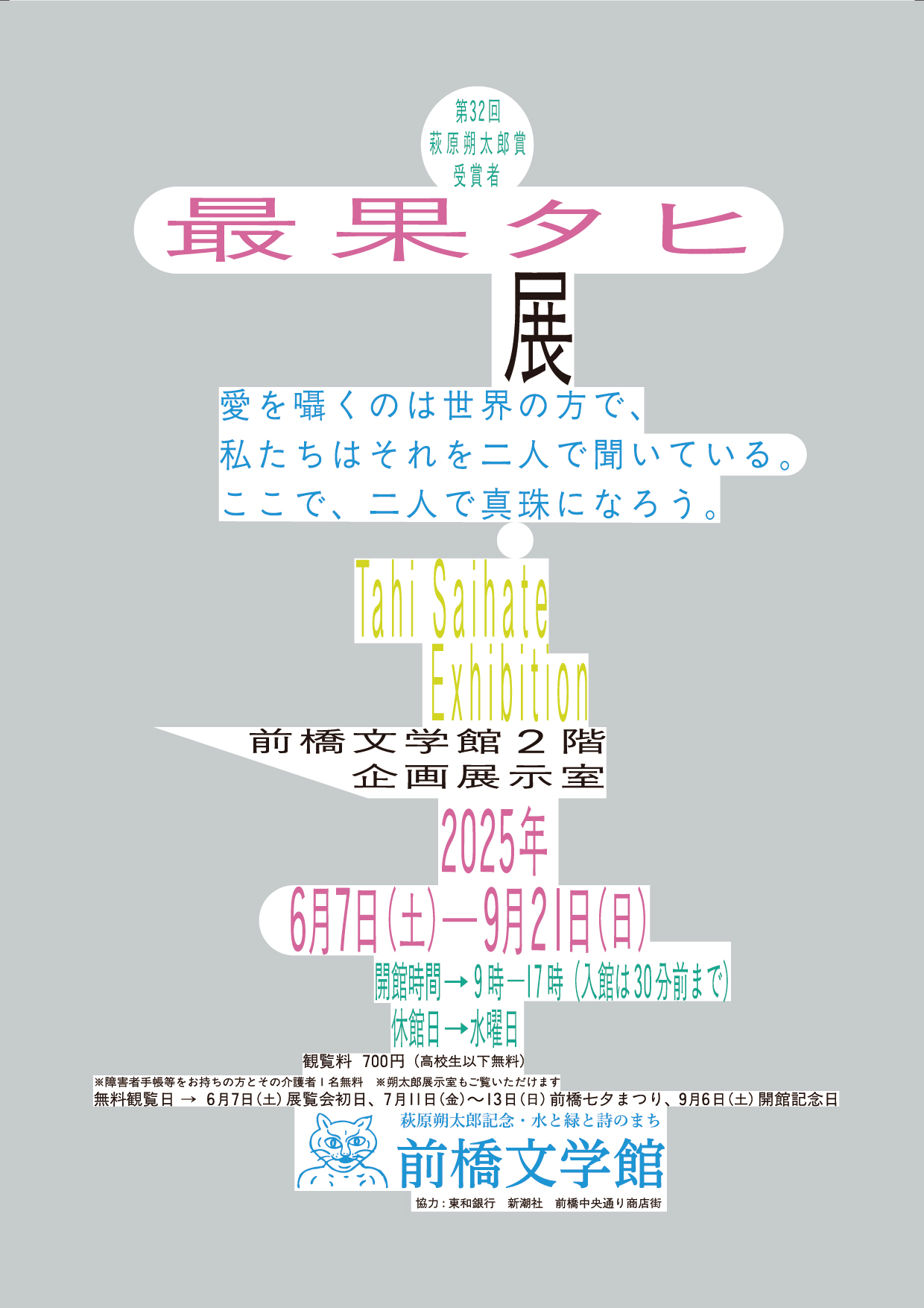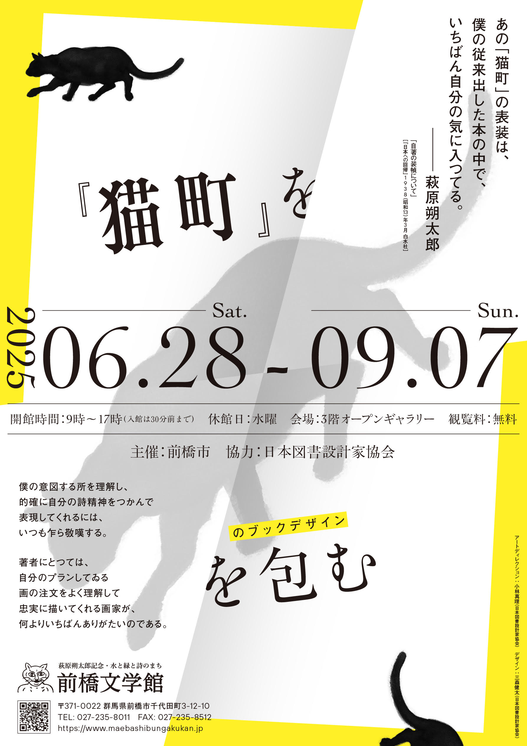 前橋文学館 萩原朔太郎とは 朔太郎の説明 萩原朔太郎賞 施設概要 特別館長のあいさつ 施設案内 利用案内 年報・館報・ブログ ミュージアムショップ 展 示 現在の企画展 過去の企画展 催し物 企画展関連イベント その他イベント 過去の催し物 収蔵資料 収蔵資料検索 資料利用申請 資料の収集方針 アクセス お問い合わせ 2025年の企画展 ロマンチックな飛翔 酒と詩人と人生と 前橋文学館収蔵資料展 期 間 : 2025年03月01日(土) ~ 2025年05月25日(日) 会 場 : 2F企画展示室 前橋文学館企画展おもいおもいのおもい展 期 間 : 2025年03月08日(土) ~ 2025年06月15日(日) 会 場 : 3Fオープンギャラリー 前橋工科大学工学部臼井研究室とのコラボ企画「おもい描く光画百年の前橋」 期 間 : 2025年03月08日(土) ~ 2025年06月15日(日) 会 場 : 1階ロビー 第32回萩原朔太郎賞受賞者展 期 間 : 2025年06月07日(土) ~ 2025年09月21日(日) 会 場 : 2F企画展示室 『猫町』を包む 期 間 : 2025年06月28日(土) ~ 2025年09月07日(日) 会 場 : 3階オープンギャラリー 前橋空襲資料展ー語り継ぐあの日の記憶、前橋にも空襲があった。 期 間 : 2025年07月19日(土) ~ 2025年08月31日(日) 会 場 : 前橋文学館1Fロビー 夢の明るい鏡ー三浦雅⼠と1970年代の輝き: 「ユリイカ」 「現代思想」の軌跡 期 間 : 2025年10月04日(土) ~ 2026年01月25日(日) 会 場 : 2階展示室 ▲TOP