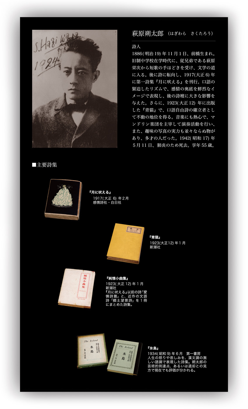 前橋文学館 萩原朔太郎とは 朔太郎の説明 萩原朔太郎賞 施設概要 特別館長のあいさつ 施設案内 利用案内 年報・館報・ブログ ミュージアムショップ 展 示 現在の企画展 過去の企画展 催し物 企画展関連イベント その他イベント 過去の催し物 収蔵資料 収蔵資料検索 資料利用申請 資料の収集方針 アクセス お問い合わせ 萩原朔太郎プロフィール&代表作 ※画像をクリックすると大きな画像が閲覧できます。 ▲TOP