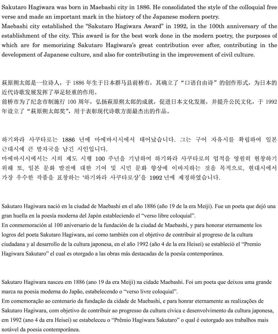 前橋市では市制施行100周年を記念し、萩原朔太郎の業績を永く顕彰し、日本文化の発展に寄与するとともに、市民文化の向上に資することを目的として、現代詩における最も優れた作品に贈る「萩原朔太郎賞」を平成4年(1992)に制定しました。
